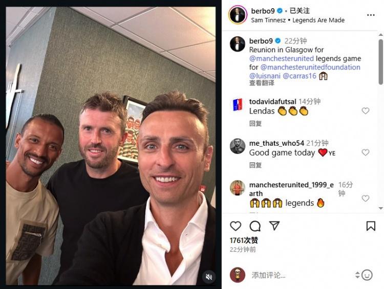 直播吧9月7日讯 曼联旧将贝尔巴托夫今天在Instagram晒出自己与前队友卡里克以及纳尼的合照。贝尔巴托夫写道:“在格拉斯哥参加曼联传奇赛,与老队友们重聚。”...